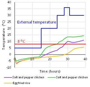 Surprisingly, ready meals kept at different levels within the same box sometimes behaved quite differently. For the box mentioned in the example above, a ready meal at the top of the box also remained below 8°C throughout, but several of the meals in the centre exceeded this maximum legal temperature (data not shown).