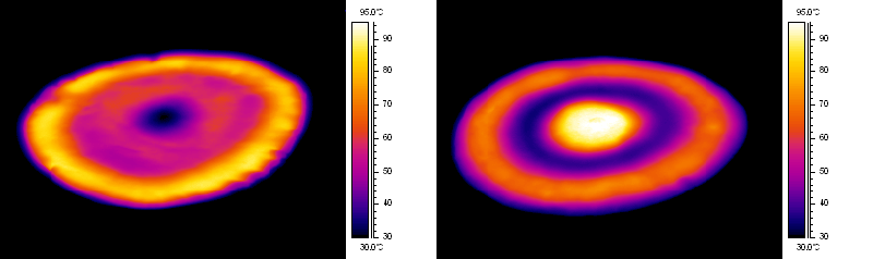 Figure 2: A visual representation of how different heating patterns can cause non-uniform heating. These two images are from separate domestic microwaves with a similar rating (wattage). When heating the same product, they were found to have different heating patterns; the right image showing a hot spot in the centre and the left showing a cold spot in the same place, but with more heating around the edge of the product.